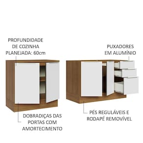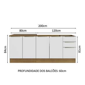 O balcão maior possui 120 cm de largura, com duas portas e três gavetas. Além disso, possui espaço para colocação de pia de inox ou pedra, na medida de 120 x60 cm. O outro balcão possui 80 cm de largura, conta com duas portas e o tampo pode ser recortado para instalação de cooktop.