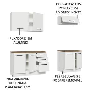 As portas são equipadas com amortecedores, assegurando um fechamento suave e silencioso, enquanto as gavetas com corrediças telescópicas possuem abertura total. Os puxadores, com alça em alumínio, oferecem durabilidade e praticidade no manuseio diário.