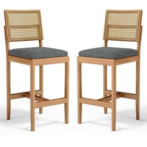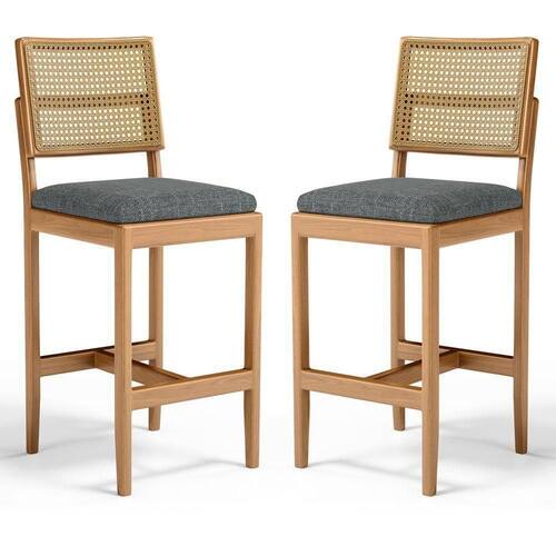 Kit Com 2 Banqueta Milena Madeira Maciça Assento Estofado Encosto De Tela Palha Sextavada Linho Chumbo 406 - Cinza