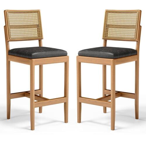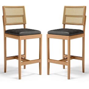 MadeiraKit Com 2 Banqueta Milena Madeira Maciça Assento Estofado Encosto De Tela Palha Sextavada Courino Preto 503 - Banquetas Banquinhos Em Madeira Maciça Encostos De Tela Palha Sextavada