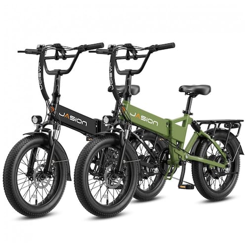 O kit com 2 bicicletas elétricas dobráveis Jasion EB7 preto jato é indicado para adultos que buscam um conjunto de e-bikes compactas com pneus largos 20x3 para uso em cidade, estradas de cascalho, neve leve e vias pavimentadas. Cada bicicleta utiliza quadro dobrável em aço carbono com suspensão dianteira e traseira, combinada a pneus fat resistentes a furos, o que favorece a estabilidade, o conforto e a absorção de impactos em pisos irregulares.