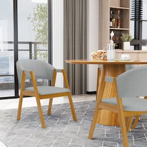 Apresentamos a você a cadeira Leticia, ela é estofada com espuma D-23 no assento, espuma D-23 no encosto e seus pés são feitos de madeiras maciças de eucalipto na cor castanho.