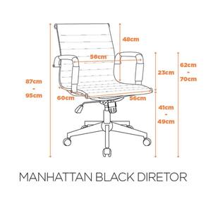 A cadeira Manhattan Diretor é toda revestida em couro ecológico com costuras horizontais, ela também possui sua base e detalhes em aço cromado, o que garante resistência e durabilidade à cadeira! Por possuir seus braços também revestidos em couro ecológico e possuir sistema relax, ela é super confortável para grandes espaços de tempo sentados. Produto Montado: Sim Ambiente Principal: Escritório codigo_ean: 7909903443422 Complexidade da Montagem: Média: pode ser montado por mais de uma pessoa e/ou necessite de maior conhecimento para montagem Cor: Preto Cor do Produto: Preto Empilhável: Não Enchimento do Assento: Não Possui Encosto Reclinável: Não Itens Inclusos: 2 Cadeiras, Kit Ferragens e Manual de Montagem Manual de Montagem e Instalação: https://product-hub-prd.madeiramadeira.com.br/870576/documents/50f0f68b-074a-4b6b-bc9d-8d6ec1d68e55deiramanhattanblackdiretor.pdf Necessita Montagem: Sim Origem do Produto: Importado Peso: 11,9 kg Possui LED: Não Possui Rodízio: Sim Recomendações de Uso, Manutenção e Limpeza: Pano Úmido Rodízio com Trava: Não Sistema de Montagem: Parafuso Suporta Até (kg): 150 kg Ean: 7909903443422