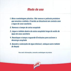 Benefícios: Harpic tablete para caixa acoplada é especialmente indicado para a limpeza completa do vaso sanitário com caixa acoplada começando pela própria caixa acoplada e chegando até as paredes do vaso sanitário. Os agentes de espuma e limpeza de vaso sanitário do tablete liberam uma agradável fragrância de pinho descarga após descarga use regularmente para manter vaso sanitário limpo e brilhante.