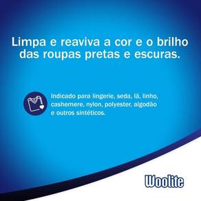 Benefcios: Um cuidado que deve ser considerado um dos mais importantes para a boa manuteno e a durabilidade das suas roupas o cuidado durante a lavagem, ele importante para manter os tecidos com a aparncia de novos por mais tempo. Woolite Roupas pretas e escuras possui frmula balanceada que limpa profundamente e reaviva a cor e o brilho das roupas pretas e escuras, juda a prevenir o desbotamento dos tecidos. Use sempre woolite para lavar: lingerie, seda, l, linho, cashemere, nylon, polyester, algodo e outros sintticos