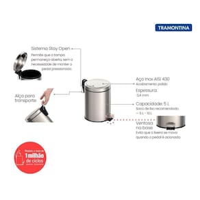 A Lixeira Inox com Pedal Tramontina Brasil 5 L com Acabamento Polido e Balde Interno é uma peça essencial para o conforto da sua casa. Fabricada no Brasil, é produzida em aço inox com acabamento polido. Possui capacidade de 5 L. É ideal para qualquer ambiente. Possui balde interno removível, (não possui alça para transporte do balde) e ventosa na base da lixeira que evita o movimento do produto quando o pedal for acionado. A tampa com ressalto e a abertura por meio do pedal garantem maior resistência, já que suporta mais de 1 milhão de ciclos (abertura e fechamento). Proporciona ambientes mais organizados e limpos para as atividades diárias.