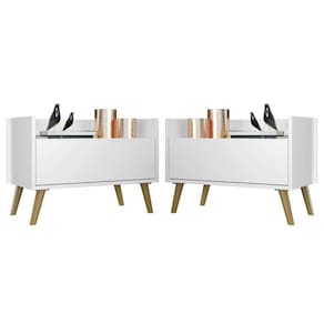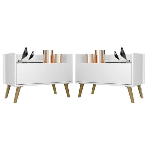 Kit Com 2 Mesas De Cabeceira 60cm Retrô Multimóveis V3633 Branca/natural Branco/natural O Kit com 2 Mesas de Cabeceira 60 cm com Pés Retrô Multimóveis é uma solução prática para você deixar seu quarto mais bonito e complementar seu ambiente. Produzido em MDP com acabamento acetinado (cerca de 20% de brilho), que garante maior durabilidade e facilidade na limpeza, possui 1 gaveta com amplo espaço interno e corrediças metálicas que proporcionam mais leveza no manuseio. Os pés retrô, em polipropileno, dão um charme especial ao móvel deixando-o com um visual leve e permitindo você compor um ambiente com ar vintage e moderno ao mesmo tempo. Seu design clean permite que seja utilizado em diferentes ambientes, adaptando-se conforme sua necessidade. Conteúdo da Embalagem: 2 (duas) mesas de cabeceira 2 (dois) kits com 4 pés retrô