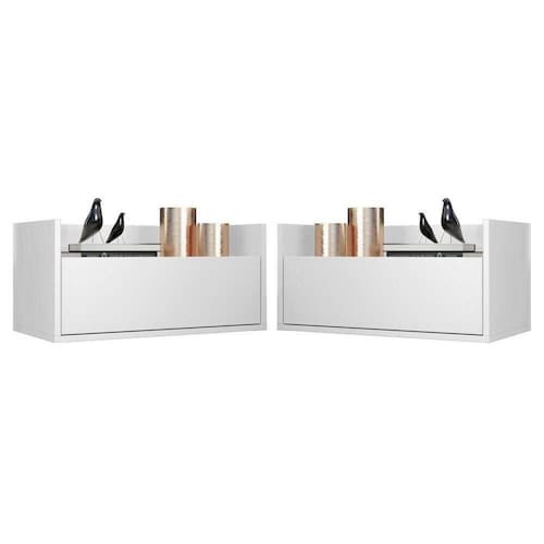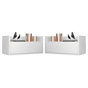 Kit Com 2 Mesas De Cabeceira 60cm Suspensa Multimóveis V3632 Branca Branco O Kit com 2 Mesas de Cabeceira 60 cm Suspensa Multimóveis é uma solução prática para você deixar o seu quarto mais bonito e complementar seu ambiente. Produzido em MDP com acabamento acetinado (cerca de 20% de brilho), que garante maior durabilidade e facilidade na limpeza, possui 1 gaveta com amplo espaço interno e corrediças metálicas que proporcionam mais leveza no manuseio. Ainda, acompanha kit para ser montado de forma suspensa, conforme a altura que você quiser do chão. Seu design clean permite que seja utilizado em diferentes ambientes, adaptando-se conforme sua necessidade. Conteúdo da Embalagem: 2 (duas) mesas de cabeceira 2 (dois) kits com suporte para mesa de cabeceira