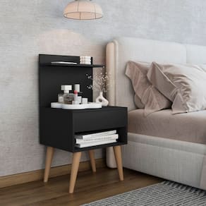 Possui 1 gaveta com corrediça metálica, 1 nicho aberto e 1 prateleira superior, garantindo espaço para livros, objetos decorativos, eletrônicos e tudo o que você precisa ter por perto.
