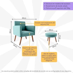 Dimensões do produto montado: Poltrona - Altura: 80cm | Largura: 64cm | Profundidade: 60cm Puff - Altura: 37cm | Largura: 43cm | Profundidade: 43cm *Você pode consultar as medidas internas na imagem técnica do produto.