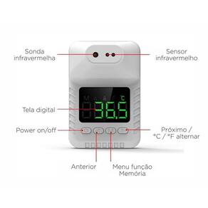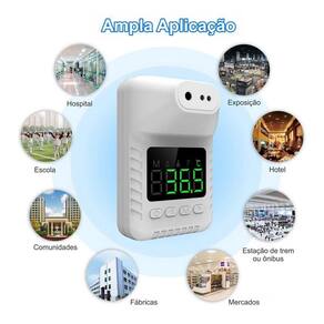 Termômetro Infravermelho Automático Inteligente de parede modelo K3-S (envio imediato) Muito mais completo: Acompanha bateria recarregável. E também há opção para 3 pilhas AAA.Acompanha cabo USB e carregador de tomada. Outros termômetros do mercado não possuem carregador.Acompanha kit instação. Pode ser instalado na parede , totem e em tripé de alumínioFunção de Voz: Português e mais 12 Idiomas. Fala em voz alta a temperatura do cliente. E opção sem voz (somente som de Bip). Função ajuste da temperatura de alarme (exclusivo)Medição de aproximadamente 50 pessoas por minuto. Alarme sonoro para temperatura corporal superior a 37,5C.- Carregamento via cabo USB, 5V ou 12V. (na tomada, computador, ou via power bank). Conector micro USB (o mais comum do mercado) Ideal para: Indústrias, Comércios, Escolas, Academias, Supermercados, Hotéis, Escritórios, Farmácias, Edifícios, Clubes, lojas de varejo, salão de beleza, dentista, entrada de estabelecimentos em geral.Indicadores:Luzes e alarmes indicadores de leitura, falha e alta temperatura. Display grande e com alta definição.Tecnologia: Infravermelho , sem contato, automático.Avisos (sonoro e iluminação): Medição, erro e alta temperaturaPrecisão: Variação inferior a 0,2CTela: Display DigitalVelocidade de Medição: 0,5 segundoDimensões termômetro: 100 x 150 x 60 mmDimensões embalagem: 120 x 155 x 66 mmDistancia de Medição: 5cm ~ 10cmPeso: 240gFaixa de Medição: 0 ~ 50CTemperatura Funcionamento: 10C ~ 40CEnergia: USB ou Bateria (inclusa) 5V, 12VNCM: 9025.1990EAN 13: 7898668651565O que acompanha:- 02 unidades do Termômetro- 02 unidades bateria regarregavel- 02 unidades carregador de parede USB- 02 cabos USB para recarga- 02 manuais de instruções- 02 kits parafuso para fixaçãoObs: - Bateria dura cerca de 1 semana em standby Funções exclusivas como operar:1. Função idioma: para selecionar o idioma desejado mantenha pressionado a tecla M até entrar no Menu função. Pressione a seta da esquerda ou da direita, até chegar em F3 que é a função Idioma. Selecionar opção 12 (português) ou opção 0, para manter somente como o Bip 2. Função volume: para ajustar o volume desejado mantenha pressionado a tecla M até entrar no Menu função. Pressione a seta da esquerda ou da direita, até chegar em F4 que é o ajuste de volume. Selecione o volume desejado pressionando as teclas da esquerda ou direita.3. Função alarme: para ajustar a temperatura de alarme mantenha pressionado a tecla M até entrar no Menu função. Pressione a seta da esquerda ou da direita, até chegar em F1 que é o ajuste alarme. O alarme vem ajustado de fábrica em 37,5C. O alarme de temperatura alta pode ser configurada no intervalo de 37C-42C