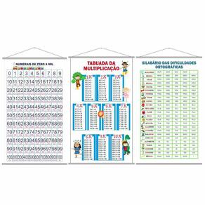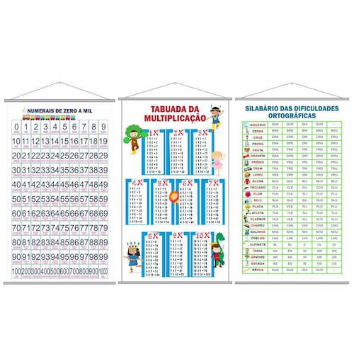 Os Banners Pedagógicos são excelentes para trabalhar de uma forma interativa o desenvolvimento dos alunos, facilitando na hora de ensinar e memorizar cada passo.Kit de Banners Pedagógicos com:- 1 um Silabário das dificuldades ortográficas- 1 um Tabuada da Multiplicação- 1 um Numerais até 1000ESPECIFICAÇÕES:Lona Vinílica altamente resistente com tamanho de 120x65cm. Imagens com alta resolução de impressão em acabamento de bastões e corda, pronto para pendurar.Acabamento: Bastões de madeira + corda na parte superior.