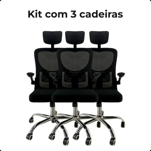 Kit com 3 cadeiras de escritório presidente mesh elegance preta