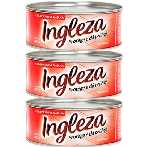 Kit com 3 ceras em pasta ingleza 400g vermelho Kit com 3 ceras ingleza em pasta vermelho 400g cada Cera pasta ingleza, a tradicional cera em pasta para proteção com rápida secagem e brilho duradouro, após o polimento com enceradeira. ideal também para polimento de móveis rústicos de madeira. Versões- vermelho Embalagens- 400 g Ambientes indicados- sala, quarto, sala de jantar Aplicação- assoalhos não sintecados, cerâmicas, mármores, pisos cimentados, móveis, portas e janelas de madeira não impermeabilizada. Atenção- não aplicar em assoalhos sintecados, pisos vinílicos e móveis impermeabilizados. Informações gerais Tradicional cera que protege e dá brilho a assoalhos não sintecados, cerâmicas, mármores, pisos cimentados, móveis, portas e janelas de madeira não impermeabilizada, deixando suave fragrância de lavanda. sua formula hidrata e é ideal para pisos e móveis rústicos. Modo de usar: aplique uniformemente sobre a superfície limpa, com auxílio de um pano, em movimentos circulares. Após secar, lustre com enceradeira e feltro. Para conservar os resultados após alguns dias, retire a poeira com auxílio de um pano úmido, passe a enceradeira com feltro e a superfície voltará a brilhar. Composição - parafina, carnaúba, solvente, corante, 1,2 benzotiazolin-3-ona e fragrância.