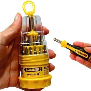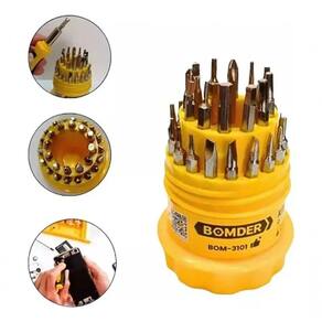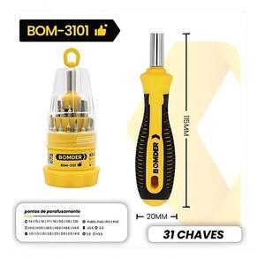 - Contém 31 pontas de chaves diversas, incluindo fenda, philips, torx, allen, além de um cabo imantado e um estojo para armazenamento.