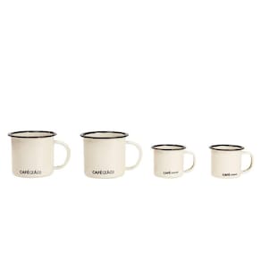 Contém 4 canecas. Não podem ser vendidas separadamente. Material: aço inoxidável e esmalte. 2 canecas de 80 ml - Dimensões (cada): 7,5 cm x 5,4 cm x 5 cm. 2 canecas de 100 ml - Dimensões (cada): 10 cm x 8 cm x 7 cm. Lavar com água, esponja macia e detergente neutro. Teme químicos e abrasivos. Não vai ao lava-louças, nem ao micro-ondas. EVITE QUEDAS E IMPACTOS! Risco de comprometer a integridade da caneca. ATENÇÃO! Cuidado ao consumir bebidas extremamente quentes! Validade indeterminada.
