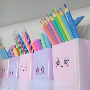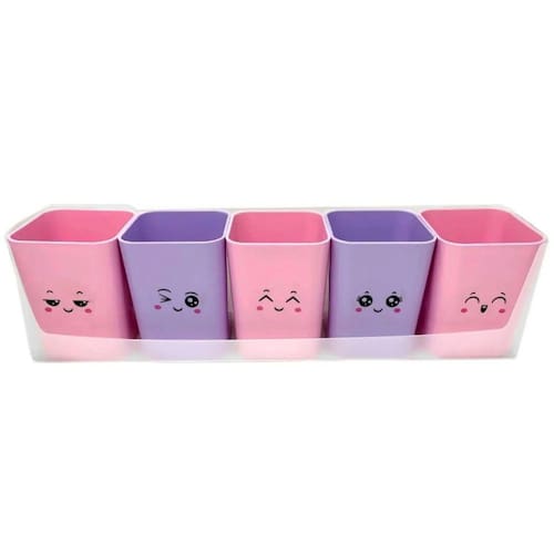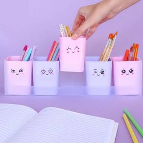 Kit acompanha suporte em PP com furos para fixação, 5 porta objetos e cartela de adesivos com 12 carinhas. Em tons pastel. Linha Serena.