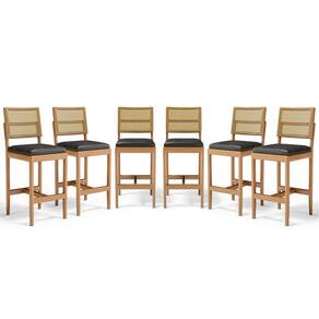 Madeira-MadeiraKit Com 6 Banqueta Milena Madeira Maciça Assento Estofado Encosto De Tela Palha Sextavada Courino Preto 503 - Banquetas Banquinhos Em Madeira Maciça Encosto De Tela Palha Sextavada