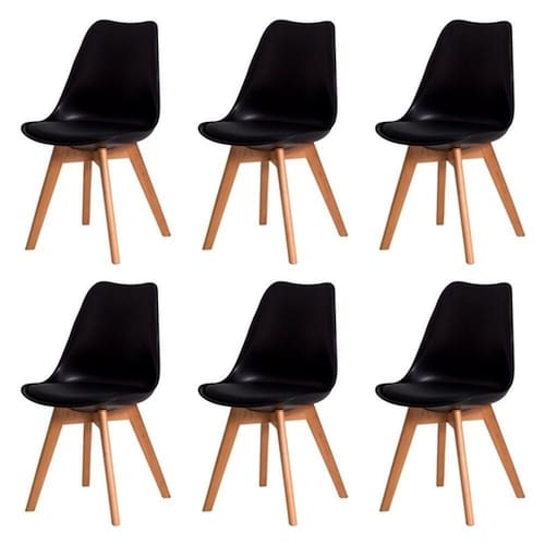 Kit Com 6 Cadeiras Leda Preta - Charles Eames Com Almofada Cadeira Leda Charles Eames Wood Do designer finlandes Eero Saarinen, a cadeira com assento estofado Saarinen representa um trabalho icônico de design da década de 50, juntamente com a Eames. Sua concha ergonômica é produzida em PP (Polipropileno) e conta com assento fixo em tecido sintetico (PU). Seus pés são feitos em madeira com ótimo acabamento. Adequa-se perfeitamente para compor conjunto de mesa de jantar ou qualquer outro ambiente em sua casa ou escritório. Ideal para receber amigos e familiares com um toque de elegância e charme.