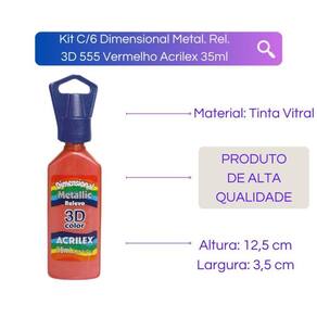 Kit com 6 Dimensional Metálica Acrilex 35ml - Escolha a Cor Cor: Vermelho 3D 555 Kit com 6 Dimensional Metálica Acrilex 35ml - Escolha a Cor Kit com 6 Dimensional Metálica é um excelente produto, tinta de excepcional versatilidade, aderência e muito fácil de usar. Pode ser aplicado diretamente com o bico ou pincel sobre tecidos de algodão não sintéticos e sem goma. Também pode ser utilizado em madeira isopor, cerâmica, vidro, cortiça, gesso e papel. Personalizando objetos que se tornam únicos e especiais. Enviaremos o seu kit em até 24 horas após a confirmação de pagamento Escolha uma das cores disponíveis no campo COR do próprio anúncio. Largura: 3,50 cm Altura: 12,50 cm Peso aproximado do Kit: 287 g Caso tenha alguma dúvida nos mande mensagem que respondemos rapidinho para te ajudar da melhor forma possível Marca: Bialluz