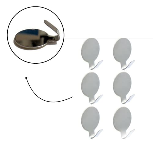 Especificações Técnicas: Material: Aço inoxidável de alta resistência Dimensões: 3 cm (altura) x 1,5 cm (largura) Capacidade de carga: até 2 kg por gancho Fixação: Adesiva (sem ferramentas) Conteúdo: 1 kit com 6 ganchos autocolantes