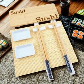 Kit Comida Japonesa 8pç Sushi Bambu Cerâmica Esteira Hashi