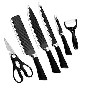 Kit Completo 6 Peças de Facas com Cutelo Tesoura Descascador Eleve a sua experiência na cozinha com este elegante conjunto de facas de corte, composto por seis peças de alta performance. Com lâminas super afiadas e revestimento antiaderente, as facas possuem um design moderno e sofisticado na cor preta, tornando-as não apenas funcionais, mas também um item de destaque em sua cozinha.