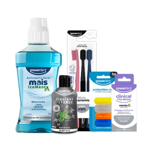 Descrição:O Kit Completo com Escova Trend Sensitive para Família Powerdent foi criado para oferecer uma rotina de higiene bucal completa, prática e eficiente para todos da casa. Com produtos de alta performance e qualidade reconhecida, esse kit garante limpeza profunda, proteção prolongada e cuidado com cada detalhe da saúde bucal. O Liquigel Defense Ice Black 100g combina frescor intenso com ação antibacteriana, enquanto o Antisséptico Bucal com Álcool Mais Ice Menta 1L potencializa a proteção contra germes e prolonga a sensação de limpeza. A Fita Dental Clinical 300m remove resíduos dos espaços interdentais com precisão e suavidade, sendo ideal para o uso diário da família inteira. A Escova de Dentes Trend Sensitive (pack com 3 unidades) possui cerdas ultramacias, perfeitas para quem busca uma escovação confortável e eficiente. Para completar, o Protetor de Cerdas Protection Cap com 4 unidades protege as escovas contra contaminações e poeira, promovendo mais higiene no armazenamento. Este é o kit ideal para famílias que valorizam cuidado completo, qualidade superior e proteção bucal contínua em todas as fases do dia.