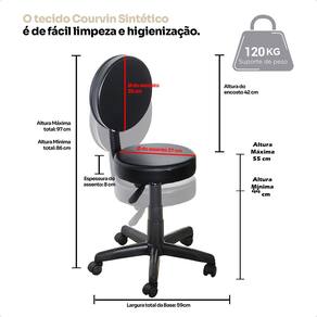 •	Cadeira Mocho com Encosto, Base Pentapé e Regulagem de altura por Pistão a Gás: ergonomia e conforto, com assento em Courvin sintético fácil de limpar, base estável e suporte para até 120 kg.