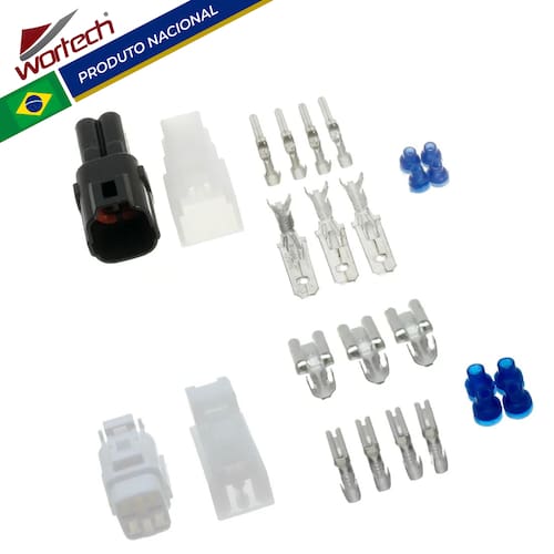 Marca: Wortech (Indústria Brasileira) Código: W-/1859Características do produto:-Conector: Em Nylon de alta qualidade-Terminais: metálicos estanhados de alta condutividadeItens Inclusos:- 1 Conector 4 vias macho- 1 Conector 4 vias fêmea- 1 Conector macho 3 vias- 1 conector fêmea 3 vias- 7 terminais macho- 7 terminais fêmea- 8 borrachas de vedaçãoGarantia total de 3 meses contra defeito de fabricação. Marca: Wortech