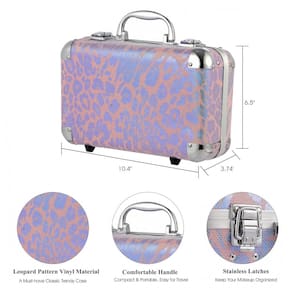 Design: Estojo rígido com alça superior, padrão leopardo rosa, modular para itens removíveis