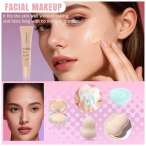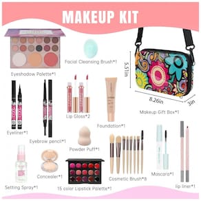 O Kit Completo de Maquiagem Venshun All-in-One organiza 18 itens essenciais em embalagem compacta com dimensões de 21,1 x 14,2 x 6,5 cm, projetado para portabilidade em viagens ou uso cotidiano. Inclui escova facial para limpeza, base líquida, spray fixador, lápis para sobrancelhas, máscara para cílios, delineador, corretivo, lápis labial, 2 gloss labiais, paleta de batons, paleta multifuncional, esponja para pó e 8 pincéis cosméticos para aplicação controlada. ?