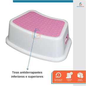 Características Técnicas – Degrau Infantil: Material: Polipropileno (PP) Modelo: Rosa Peso suportado: Até 80kg Peso: 0,46 kg Dimensões: 13,5cm (A) x 26,5cm (L) x 37cm (C) Medidas da base dos pés: 19cm (L) x 29cm (C) Idade recomendada: A partir de 18 meses Ref.: 17282