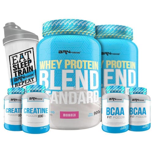 O kit perfeito para uma recuperação muscular após treinos intensos para quem tem como objetivo definição e aumento de massa muscular, energia e performance.O kit é composto por:- 02 unid. De Whey Protein Blend 900g Morango- 02 unid. De Creatina 100g- 02 unid. De BCAA 100g- 01 CoqueteleiraWhey protein blend standard brn foods é elaborada para atender uma variedade de dietas e estilos de vida. Sua fórmula garante uma rápida recuperação do glicogênio muscular perdido durante o treino e promove uma excelente absorção da proteína. Se você pratica treinos intensos e desgastantes a solução ideal para suprir as necessidades de aminoácidos e carboidrato que você precisa em um único produto é blend standard.Creatine foods:Proveniente de um composto produzido naturalmente pelo organismo, a creatina é formada a partir da associação de 3 aminoácidos de alto valor biológico: arginina, glicina e metionina. A creatine foods 100% é usada pelo tecido muscular para a produção de fosfocreatina, fator importante na formação de adenosina trifosfato atp , que funciona como um repositor de energia.Recomenda-se a ingestão com água, ou conforme orientação de um médico ou nutricionista. Pode-se adicionar algum carboidrato, como maltodextrina ou sacarose na água, para facilitar seu transporte para dentro da célula muscular.Bcaa fit foods:Indispensável para a manutenção e o crescimento dos músculos o bcaa fit foods promove uma maior recuperação muscular e aumento da resistência no pré e pós-treino, fornecendo um maior efeito anti-catabólico sendo um importante suplemento alimentar para ganhos de massa e recuperação muscular.Produto isento de registro segundo rdc nº 27 de 06/08/2010 anvisa .