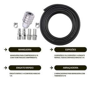 Kit Completo Mangueira De Ar 10M E Acessórios Para Compressor O kit completo para suas necessidades de conexão de ar comprimido Este conjunto prático inclui todos os componentes essenciais para garantir uma conexão segura e eficiente em seu sistema de ar comprimido. conteúdo do Kit: 1x Engate Rápido para Ar 1/4 com Rosca Fêmea 1/4: Facilita a conexão e desconexão rápida e segura das ferramentas pneumáticas, garantindo maior agilidade em suas atividades. 1x Pino Conector 1/4 x Rosca Fêmea 1/4: Ideal para conexões precisas, proporcionando uma vedação perfeita e sem vazamentos. 1x Pino Conector 1/4 x Rosca Macho 1/4: Versátil e resistente, é compatível com diversas ferramentas e acessórios pneumáticos. 1x Espigão M. FX 1/4 NPT x Mangueira 5/16: Perfeito para adaptar a mangueira ao sistema de ar, garantindo uma conexão firme e segura.