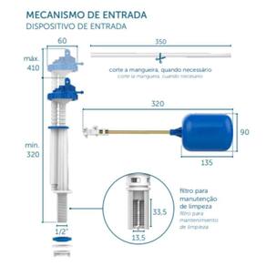 - Marca: Blukit; - Referência: 340241; - Material: Plásticos de Engenharia e Elastômeros; - Acionador: Branco; - Acompanha vedação, kit para fixação, mecanismo de entrada e saída; - Ciclos de garantia: 15.000; - Classe de pressão: 1 a 75 m.c.a.; - Possui filtro para manutenção de limpeza; - Nível de água ajustável na caixa de descarga; - Rosca de entrada: 1/2''; ?- Rosca de saída: 2''; - Temperatura máxima de trabalho: 45 C; - Compatível com o padrão de vasos sanitários convencionais; - Garantia: 12 meses junto ao fabricante.