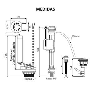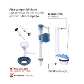 Componentes do kit: -Mecanismo de Entrada para Caixa Acoplada; -Mecanismo de Saída Universal para Caixa Acoplada -Anel de Vedação para Caixa Acoplada Universal; -Mecanismo Acionador Em ABS Cromado Para Caixa Acoplada; -Kit 2 Parafusos de Fixação Caixa Acoplada.