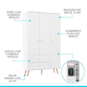 Guarda Roupa Retr? 120x206cm 3 Portas 2 Gavetas MDP Branco Menu M?veis