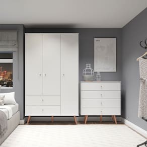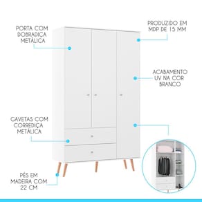 Caracter?sticas do Guarda-Roupa: Produzida em MDP de 12 e 15 mm Acabamento UV 03 Portas com Dobradi?as Met?licas 02 Gavetas com Corredi?as Met?licas Puxadores Ponto em ABS Cinza P?s Retr? em Madeira com 22 cm