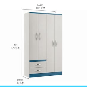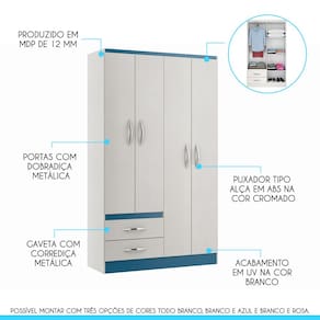 Você merece o melhor quando se trata de móveis para sua casa e a escolha certa para atender todas as suas necessidades. Com um design atual, une versatilidade, conforto e beleza. Com o Kit de Guarda-Roupa e Cômoda, você terá muito espaço para manter tudo organizado. Dispõe da montagem flex, possibilitando escolher qual cor combina mais com o seu ambiente, toda branca, branca e azul ou branca e rosa. Produzida com materiais de excelente qualidade, garantindo a sua resistência ao desgaste diário e mantendo sua beleza e funcionalidade por muito tempo. O melhor em móveis no design atual aliando conforto, qualidade e ótimos preços, só na Menu Móveis! CARACTERÍSTICAS TÉCNICAS GUARDA-ROUPA: - Produzido em MDP de 12 mm - Acabamento UV na cor Branco - Portas com Dobradiça Metálica - Gavetas com Corrediça Metálica - Puxadores Alça em ABS na cor Cromado INFORMAÇÕES TÉCNICAS GUARDA-ROUPA: Altura: 179 cm Largura: 105 cm Profundidade: 40 cm Peso: 51 kg CARACTERÍSTICAS TÉCNICAS CÔMODA: - Caixa em MDP de 12 mm - Acabamento UV na cor Branco - Portas com Dobradiça Metálica - Gavetas com Corrediça Metálica - Puxadores Alça em ABS na cor Cromado INFORMAÇÕES TÉCNICAS CÔMODA: Altura: 93 cm Largura: 90 cm Profundidade: 40 cm Peso: 32 kg INFORMAÇÕES ADICIONAIS: *ATENÇÃO: Não trabalhamos e não nos responsabilizamos pela montagem do móvel. Antes da montagem conferir se o produto está de acordo com o que comprou, produto montado e danificado pela montagem não será aceito troca. **As imagens ambientadas são meramente ilustrativas e podem apresentar itens que não compõe o produto. As cores do produto podem variar de acordo com o monitor, a iluminação do ambiente ou sua percepção visual. ***Limpeza: Deve ser feita com pano macio e seco ou levemente umedecido com água e sabão neutro. Não devem ser utilizados abrasivos como palha de aço e objetos cortantes. Garantia para defeitos de fabricação conforme Código de Defesa do Consumidor.