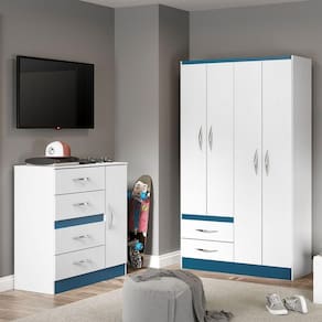 Você merece o melhor quando se trata de móveis para sua casa e a escolha certa para atender todas as suas necessidades. Com um design atual, une versatilidade, conforto e beleza. Com o Kit de Guarda-Roupa e Cômoda, você terá muito espaço para manter tudo organizado. Dispõe da montagem , possibilitando escolher qual cor combina mais com o seu ambiente, toda branca, branca e azul ou branca e rosa. Produzida com materiais de excelente qualidade, garantindo a sua resistência ao desgaste diário e mantendo sua beleza e funcionalidade por muito tempo. O melhor em móveis no design atual aliando conforto, qualidade e ótimos preços, só na Menu Móveis!