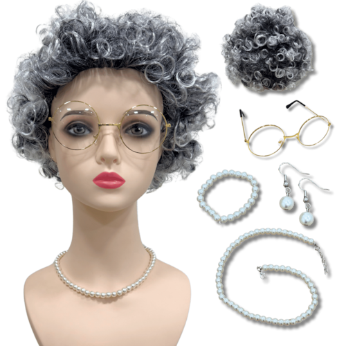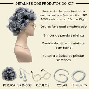 - Fibra kanekalon pet; - 25cm de comprimento; - Modelo Wig Tradicional; - Temperatura máxima aceita 130º ; - Tamanho da peruca M (Produto flexível); - 90 gramas em média;- Kit completo com peruca, brincos, óculos, colar e pulseira.