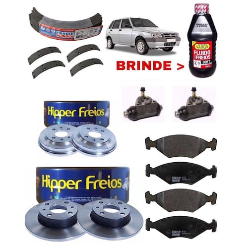KIT REVISÃO DE FREIOS FIAT SERVE NOS CARROS: FIAT UNO MODELO QUADRADO ANO 1984 ATÉ 2004 (FAVOR NOS INFORMAR O CARRO ANTES DE FINALIZAR A COMPRA PARA CONFERIRMOS SE O KIT SERVE NO CARRO) O KIT CONTÉM: 1 JOGO PASTILHA PD25 1 PAR DISCO SÓLIDO HF31 1 JOGO LONA FI90 1 PAR TAMBOR HF36 1 PAR CILINDRO RODA C-3353 1 VIDRO ÓLEO 500ML