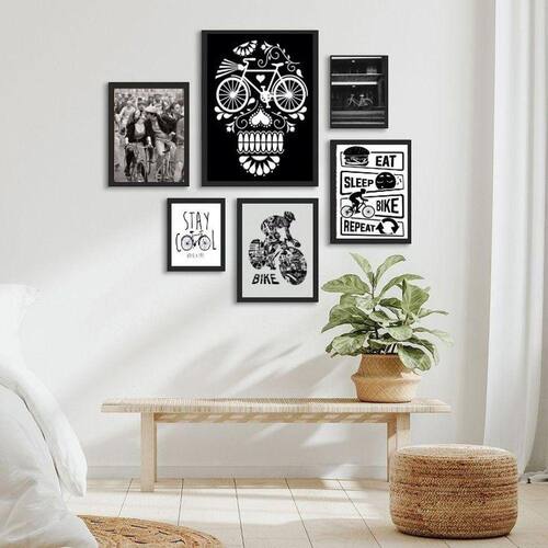 Kit composição 6 quadros cantinho da bike Moldura: madeira branca Informações do produto tire todas as suas dúvidas no descritivo abaixo: decoração para quarto, sala, cozinha, escritório, área gourmet e muito mais. Chega de paredes vazias medidas - kit composto por 6 quadros, sendo 2 quadros com medida 18x24cm, 3 quadros com 24x33cm e 1 quadro com medida 33x45cm. Material do papel - papel fotográfico brilhante de altíssima resolução acabamento - todos os quadros são acompanhados de uma película de acetato para proteção da imagem. - os quadros são embalados de forma segura com plástico bolha com camada dupla de acordo com o tamanho dos quadros. Garantia - garantia de 3 meses. Meu quadro chegou. Como posso fixá-lo Você precisa apenas de um martelo e um prego, pois os quadros já vão acompanhados de penduradores. Esta é a forma mais indicada. Caso prefira, você pode utilizar uma fita dupla face neste caso, sugerimos de alta qualidade para evitar que descole e seu quadro caia . Como posso limpar meu quadro A limpeza é feita como um móvel comum da sua casa. Apenas um pano seco ou espanador são suficientes para tal