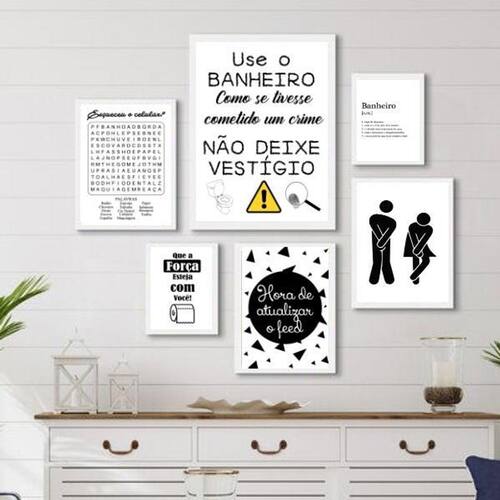 Kit composição 6 quadros divertidos banheiro Moldura: madeira preta Informações do produto tire todas as suas dúvidas no descritivo abaixo: decoração para quarto, sala, cozinha, escritório, área gourmet e muito mais. Chega de paredes vazias medidas - kit composto por 6 quadros, sendo 2 quadros com medida 18x24cm, 3 quadros com 24x33cm e 1 quadro com medida 33x45cm. Material do papel - papel fotográfico brilhante de altíssima resolução acabamento - todos os quadros são acompanhados de uma película de acetato para proteção da imagem. - os quadros são embalados de forma segura com plástico bolha com camada dupla de acordo com o tamanho dos quadros. - de 3 meses. Meu quadro chegou. Como posso fixá-lo Você precisa apenas de um martelo e um prego, pois os quadros já vão acompanhados de penduradores. Esta é a forma mais indicada. Caso prefira, você pode utilizar uma fita dupla face neste caso, sugerimos de alta qualidade para evitar que descole e seu quadro caia . Como posso limpar meu quadro A limpeza é feita como um móvel comum da sua casa. Apenas um pano seco ou espanador são suficientes para tal Ean: 7893765462618