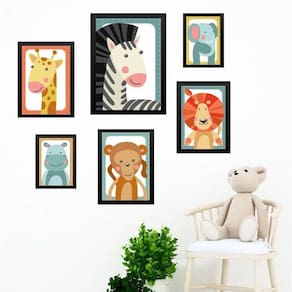 Kit composição 6 quadros infantis bichos safari Cor: moldura branca Informações do produto tire todas as suas dúvidas no descritivo abaixo: decoração para quarto, sala, cozinha, escritório, área gourmet e muito mais. Chega de paredes vazias medidas - kit composto por 6 quadros, sendo 2 quadros com medida 18x24cm, 3 quadros com 24x33cm e 1 quadro com medida 33x45cm. Material do papel - papel fotográfico brilhante de altíssima resolução acabamento - todos os quadros são acompanhados de uma película de acetato para proteção da imagem. - os quadros são embalados de forma segura com plástico bolha com camada dupla de acordo com o tamanho dos quadros. Garantia - garantia de 3 meses. Meu quadro chegou. Como posso fixá-lo Você precisa apenas de um martelo e um prego, pois os quadros já vão acompanhados de penduradores. Esta é a forma mais indicada. Caso prefira, você pode utilizar uma fita dupla face neste caso, sugerimos de alta qualidade para evitar que descole e seu quadro caia . Como posso limpar meu quadro A limpeza é feita como um móvel comum da sua casa. Apenas um pano seco ou espanador são suficientes para tal