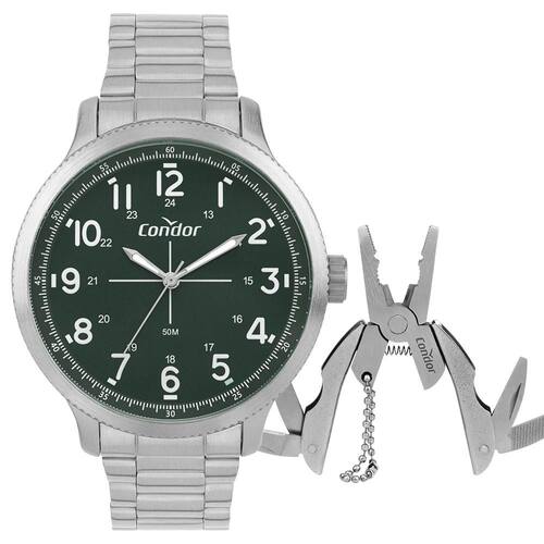 O Kit Condor CO2035NRV/K4V une estilo e funcionalidade para o homem moderno. O relógio tem caixa de 45 mm com mostrador verde escuro e números brancos em estilo militar (12/24 horas), oferecendo excelente visibilidade para o uso diário.