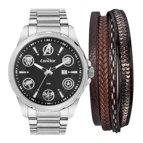 Kit Condor Masculino Speed Prata - Co2115mzo/ki4p Co2115mzo/ki4p Os super heróis da Marvel chegaram nos Kits Condor Par Perfeito! Modelo com mostrador preto com símbolos dos Vingadores na posições das horas, pulseira de aço 3 links prata, caixa 48mm e 50 metros de resistência à água e ainda acompanha um lindo conjunto de pulseiras. Perfeito para quem é fã desses incríveis personagens. Gênero - Masculino Cor da Caixa - Prata Material da Pulseira - Aço Mostrador - Analógico Formato da Caixa - Redondo Cor do Mostrador - Preto Garantia - 12 meses Cor da Pulseira - Prata Largura da Caixa (cm) - 4,8 Resistência à Água - 5 ATM Cor - Prata Tamanho - Grande Gênero - Masculino