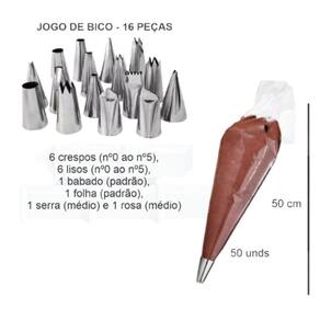Kit confeiteiro especial para aqueles que estão iniciando no ramo da confeitaria ou para quem quer renovar seus utensílios. Conteúdo: Bailarina plástico 30 cm Manga descartável 50 unid. Jogo de bico inox 16 peças: 6 crespos nº0 ao nº5 6 lisos nº0 ao nº5 1 babado padrão 1 folha padrão 1 serra médio 1 rosa médio