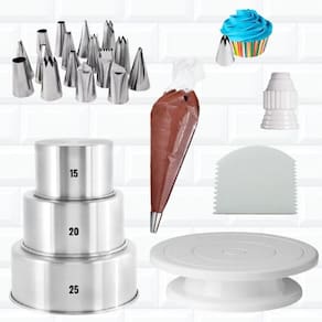 Saco para confeitar descartável - 6 unds grande Bico crespo especial 1m - m Jogo de bico para confeitar - 16 peças Adaptador para bico de confeitar Bailarina giratória - polipropileno - 30 cm branca Kit formas redondas 10 cm - 3 peças 15, 20 e 25 cm Marca: Não Informado